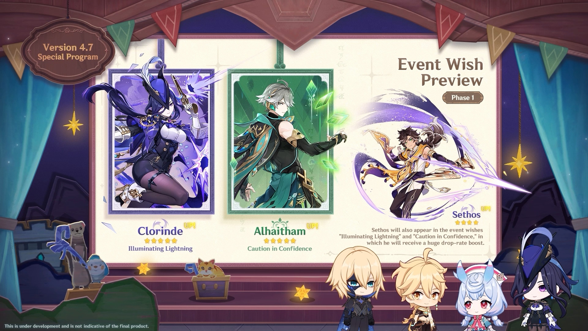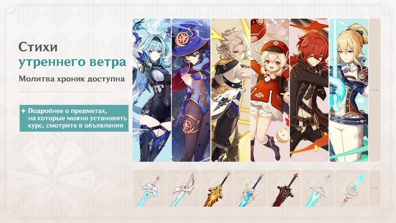 Также впервые показался баннер молитвы хроник, где помимо стандартных персонажей Дилюка, Моны и Джинн были также Кли, Альбедо и Эола вместе с некоторыми ивентовыми оружиями.