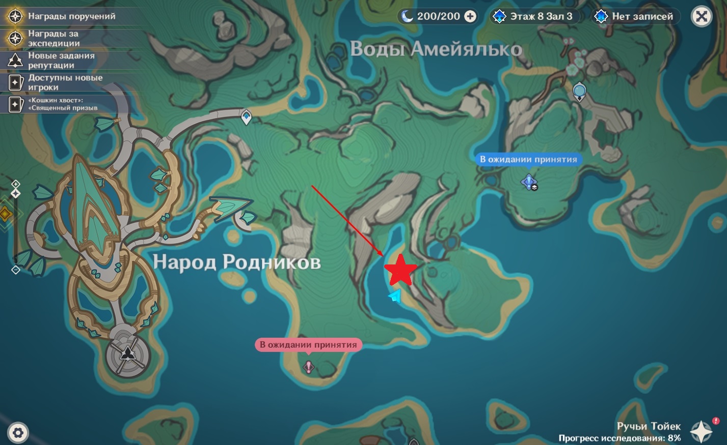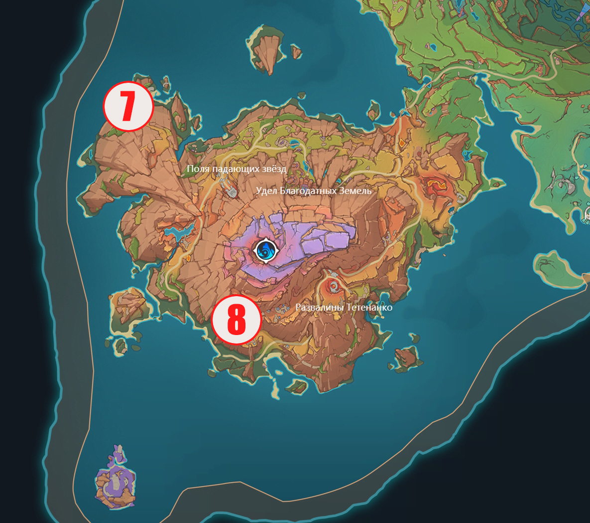 Находится на побережье в Водах Амейялько (на востоке от поселения Народа Родников). Вы без проблем доберетесь до него от статуи Семи Архонтов в этой локации или от телепорта на входе в Край горячих источников.