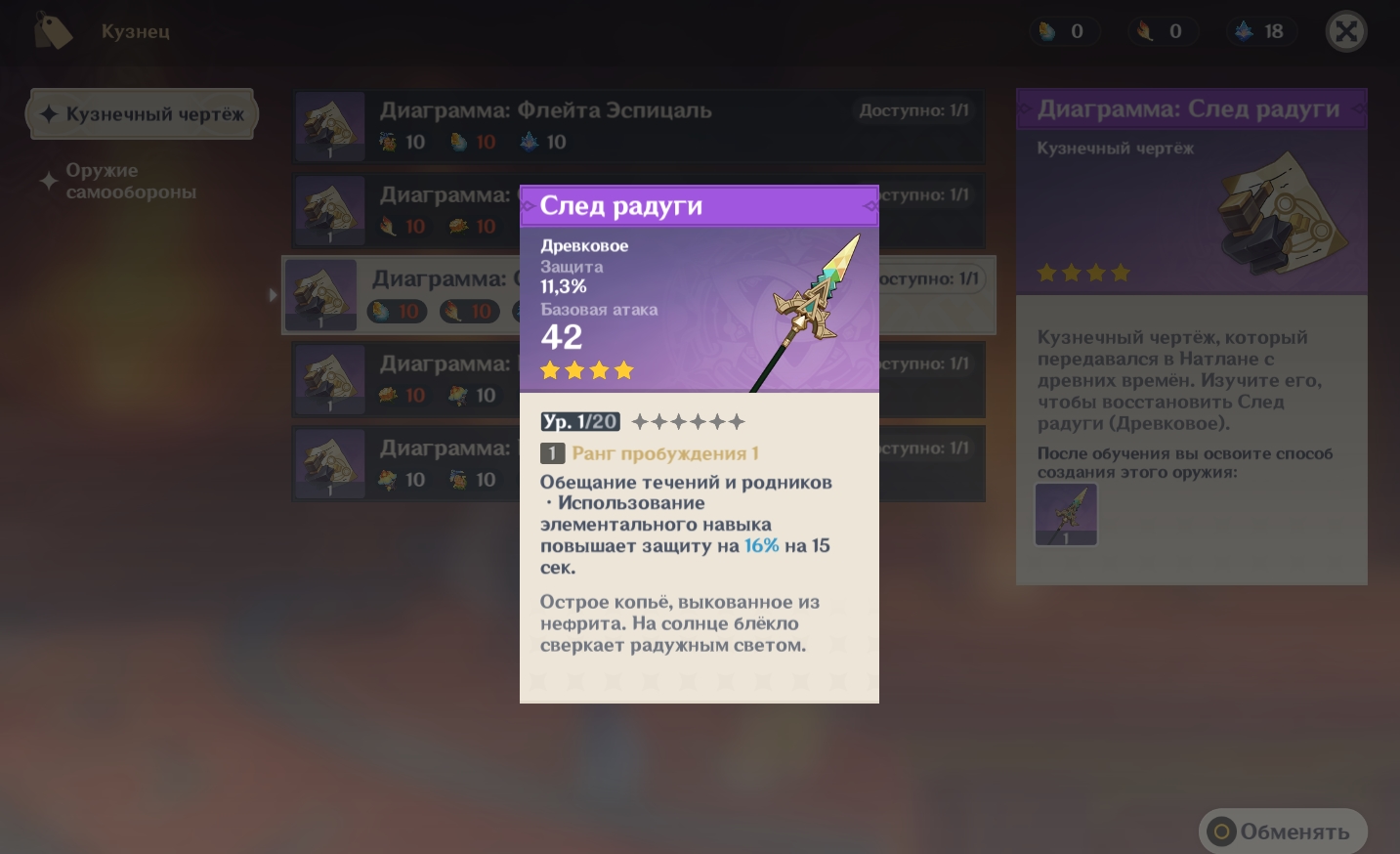 Разблокировав соответствующий чертеж, посетите любого кузнеца в Тейвате и оставьте ему заказ на создание предмета. Чтобы скрафтить След радуги, вам нужно подготовить 500 моры и следующие материалы: