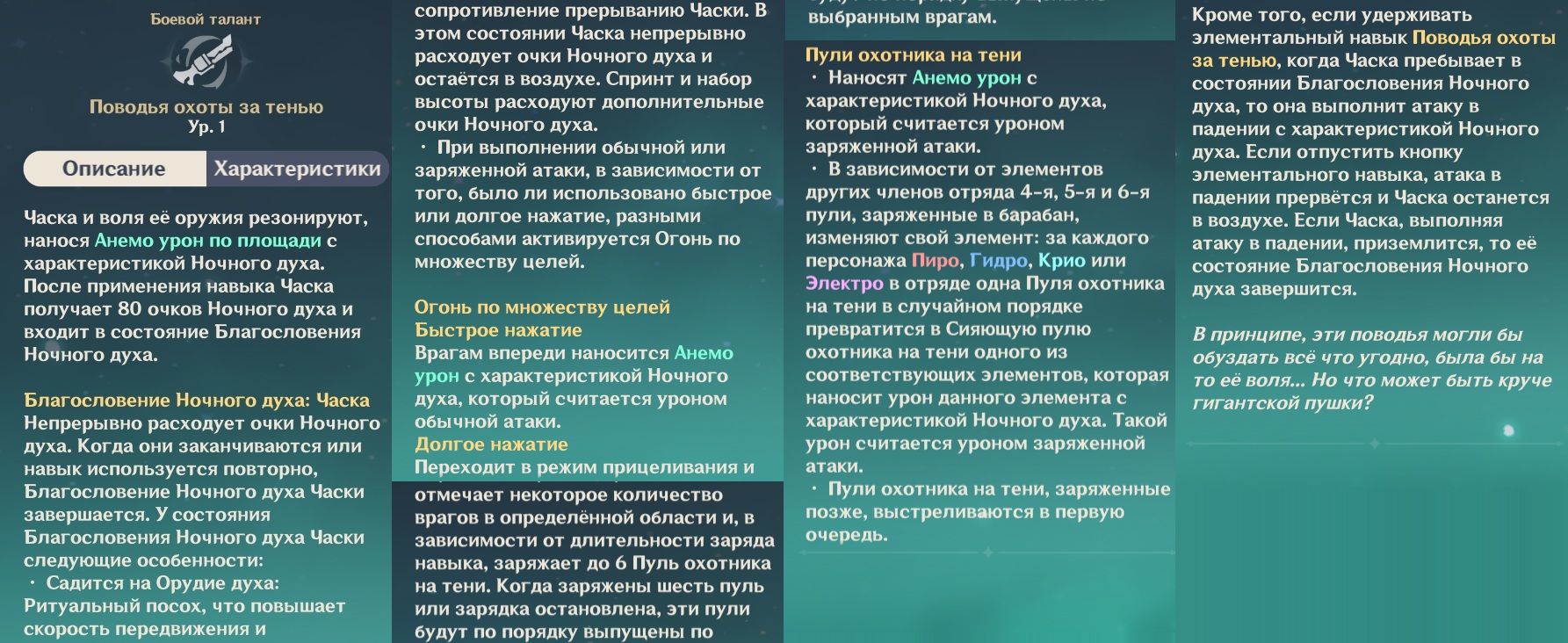 - «Намерение прикрыть». Когда ближайший союзник активирует Вспышку Ночного духа, Часка атакует монстра поблизости Горящей пулей охотника на тени и наносит ему Анемо урон с характеристикой Ночного духа. Объем урона равен 150% урона Пули охотника на тени от способности «Поводья охоты за тенью». Если в команде есть герои Гидро/Электро/Пиро/Крио стихий, то Горящая пуля охотника на тени меняет свой элемент и наносит урон соответствующей стихии с характеристикой Ночного духа. Объем урона данной атаки также равен 150% урона Пули охотника на тени от способности «Поводья охоты за тенью» и этот урон считается уроном заряженной атаки.