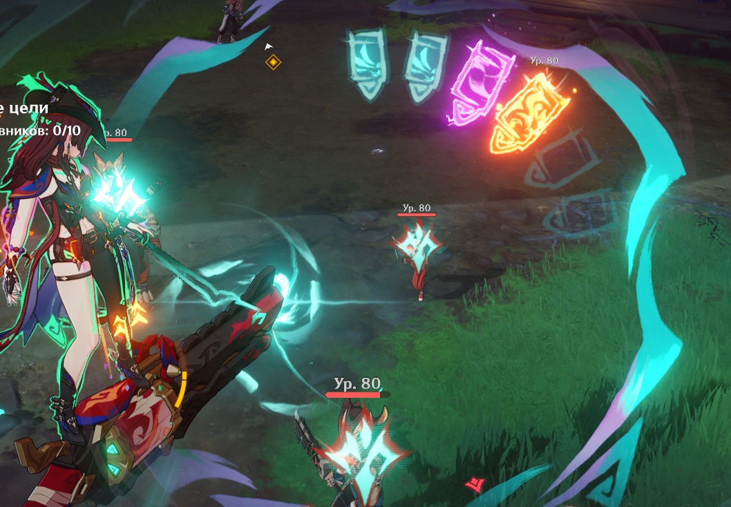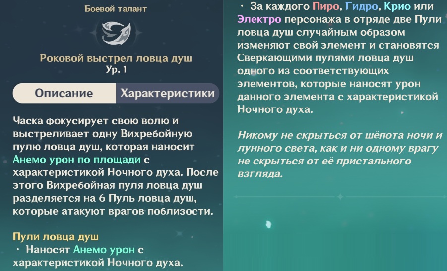 За каждого Гидро/Электро/Пиро/Крио союзника в отряде 2 Пули ловца душ рандомным образом меняют свой элемент и превращаются в Сверкающие пули ловца душ одного из соответствующих элементов, наносящих урон с характеристикой Ночного духа.