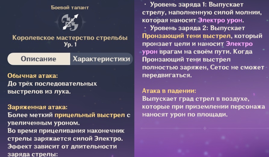 - Уровень заряда 2. Персонаж стреляет Пронзающим тени выстрелом, который пронзает врагов на своем пути и наносит им Электро урон. Когда Пронзающий тени выстрел полностью заряжен, Сетос лишается возможности двигаться.