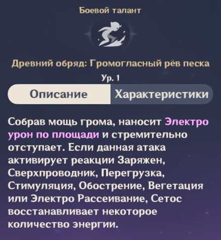 После активации «Древний обряд: Громогласный рев песка» персонаж наносит урон от Электро и отскакивает назад. Если данная атака запускает реакции «Обострение», «Вегетация», «Заряжен», «Перегрузка», «Сверхпроводник», «Стимуляция» или «Рассеивание (Электро)», то Сетос восстанавливает немного элементальной энергии.