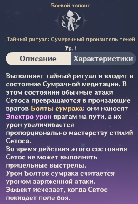 «Тайный ритуал: Сумеречный пронзитель теней» накладывает на персонажа состояние Сумрачной медитации. Пока оно действует, обычные атаки превращаются в Болты сумрака – наносят Электро урон всем противникам на своем пути. Их урон увеличивается пропорционально мастерству стихий Сетоса.