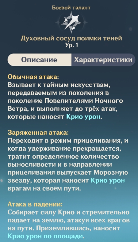 «Духовный сосуд поимки теней» позволяет герою выполнить до 3 атак, наносящих урон от Крио. Заряженная атака дает возможность использовать режим прицеливания. Когда вы прекращаете удерживать кнопку умения, расходуется определенный процент выносливости и враги, в направлении которых наведен прицел, получают крио-урон от Морозной звезды.