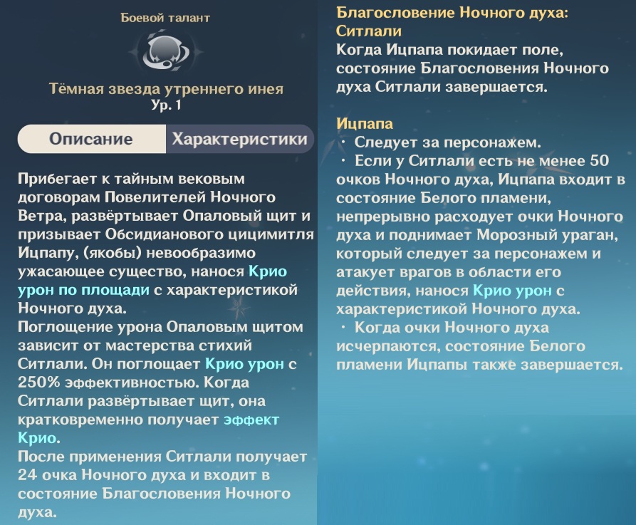 - Если у Ситлали не менее 50 очков Ночного духа, существо получает состояние Белого пламени. Находясь в нем, оно непрерывно тратит очки Ночного духа и создает Морозный ураган, следующий за персонажем и атакующий врагов в области своего действия, нанося им Крио урон с характеристикой Ночного духа;