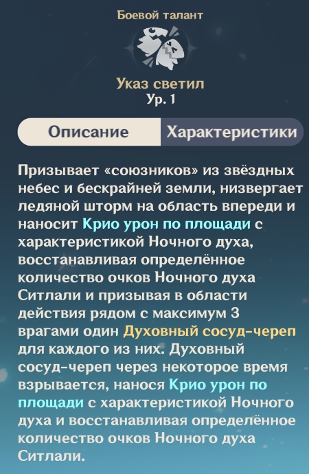 «Указ светил» наносит АОЕ урон от Крио с характеристикой Ночного духа и восполняет определенное количество очков Ночного духа. Кроме того, после активации ультимейта рядом с ближайшими врагами (максимум 3) появляется Духовный сосуд-череп – по одному для каждого монстра. Духовный сосуд-череп спустя некоторое время взрывается и наносит АОЕ-урон от Крио с характеристикой Ночного духа, восстанавливая определенное количество очков Ночного духа персонажу.