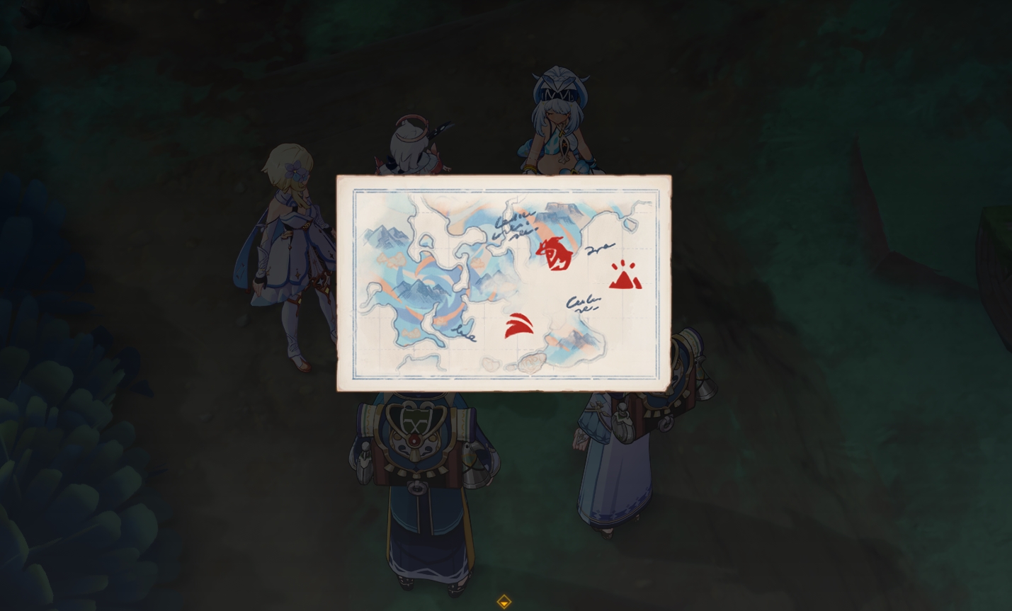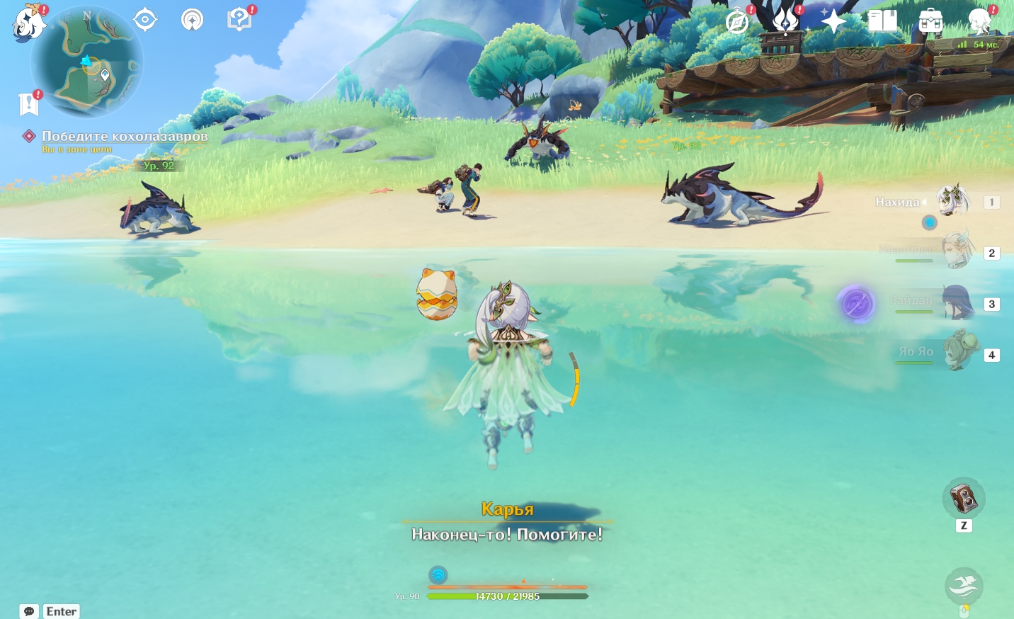 Когда существа разбегутся, поговорите с Карьей и Вирамдрой. Они скажут, что прибыли сюда из Сумеру, чтобы поймать одного из кохолазавров, который, по их мнению, укажет им местоположение таинственного острова из местных легенд. Ученые попросят Путешественницу помочь им в поимке одного из существ, но героиня откажется. Однако загадочный остров весьма заинтересует Паймон и она предложит поговорить о нем с кем-то из представителей Народа Родников.