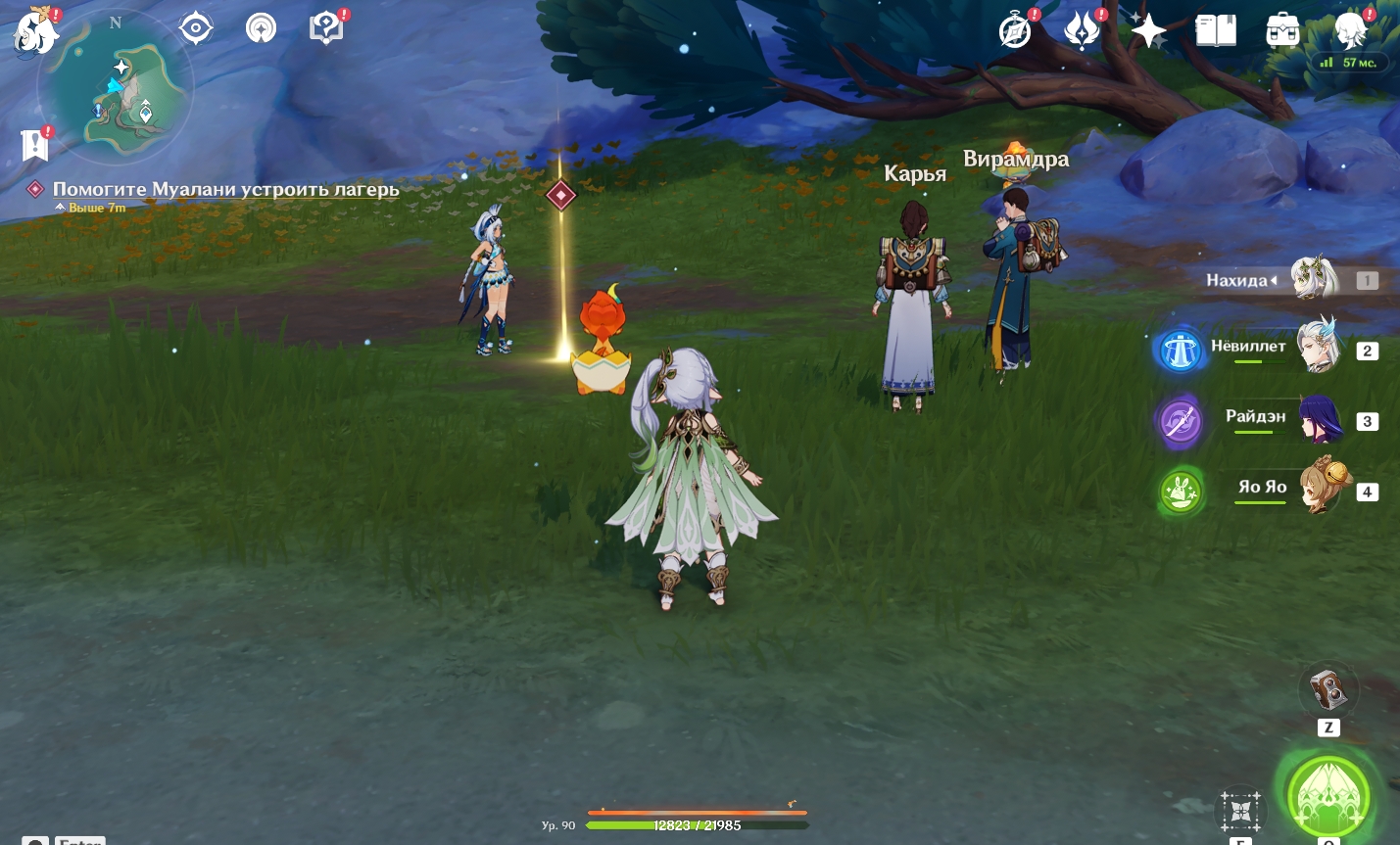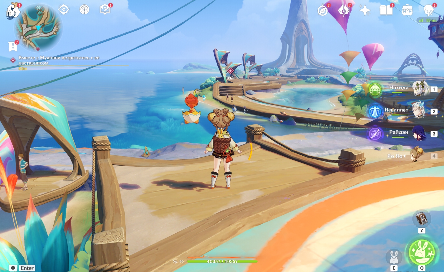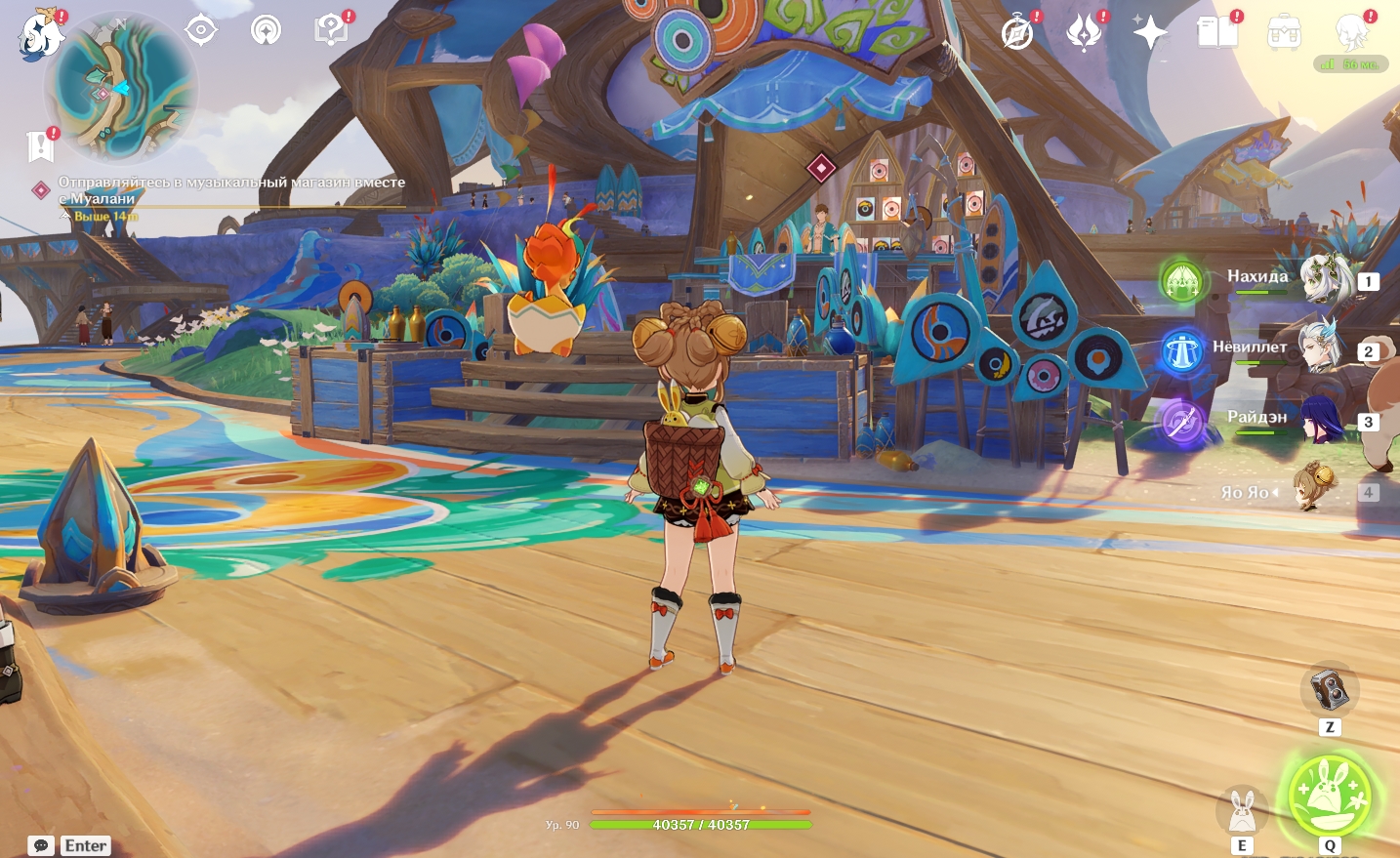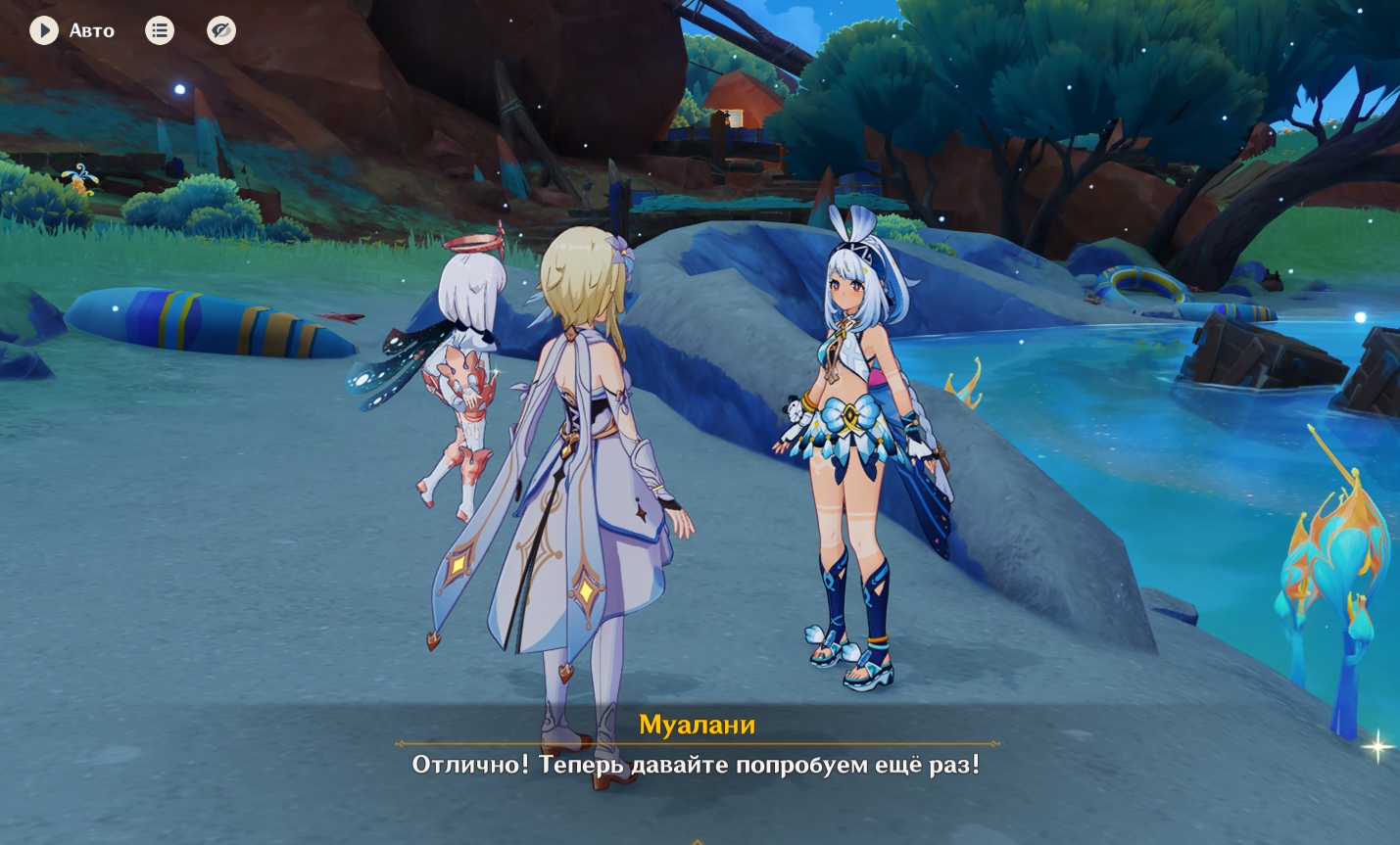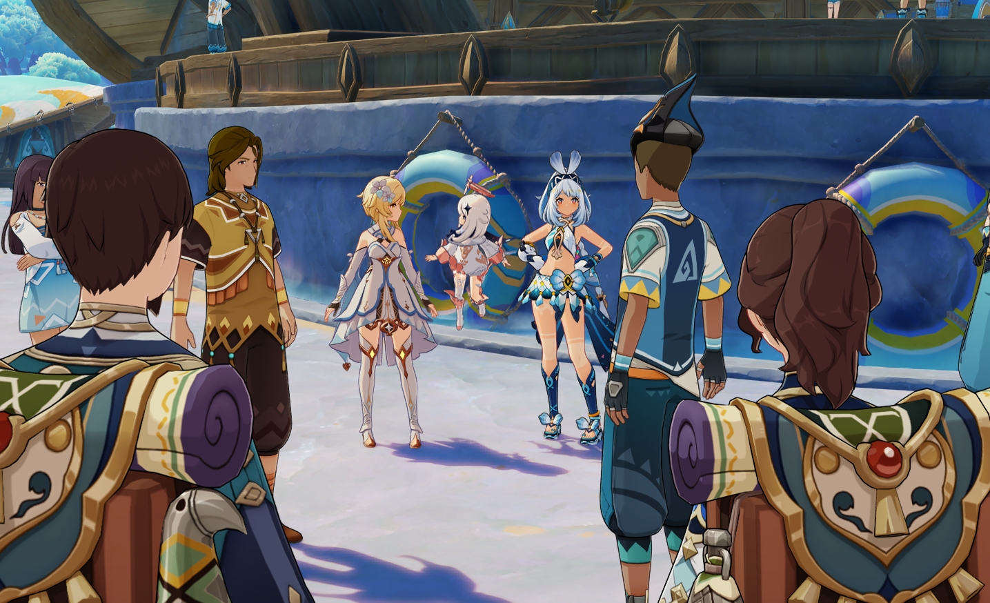 На площади также будут находится ученые из Сумеру. Те самые, которых Путешественница спасла в 1 Акте. Судя по разговору, они хотят нанять Коолау, но он откажется. После того, как Коолау уйдет, Муалани согласится сопровождать главную героиню и Паймон. И, что не удивительно, за ними увяжутся Карья и Вирамдра. Им удастся уговорить Муалани взять их с собой, но для начала ей нужно подружиться с новыми знакомыми, чтобы в пути не возникло проблем.