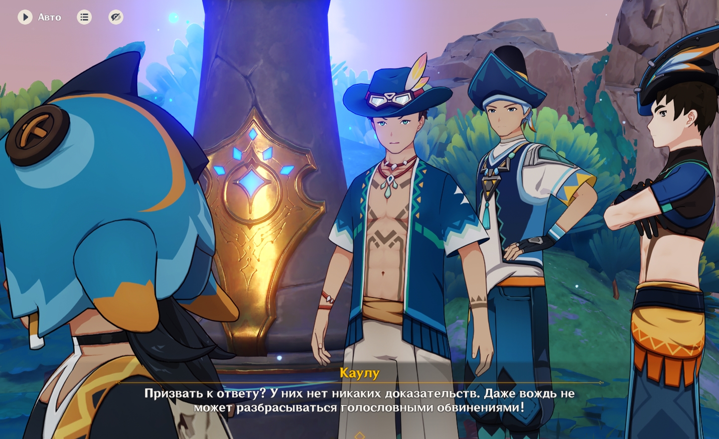 Встретившись с Каулой, идите по его совету к берегу напротив. Там снова запустится кат-сцена с проводником, в ходе которой он сообщит, что довел клиентов до таинственного острова и теперь его миссия окончена. На данном моменте Путешественница и Паймон признаются, что они не туристы, а люди, работающие по поручению Амины. Но ему будет все равно, поскольку он уверен, что доказать его мошенничество невозможно. Однако Каула ошибается. За ним следили шпионы Амины и они не дадут ему сбежать.