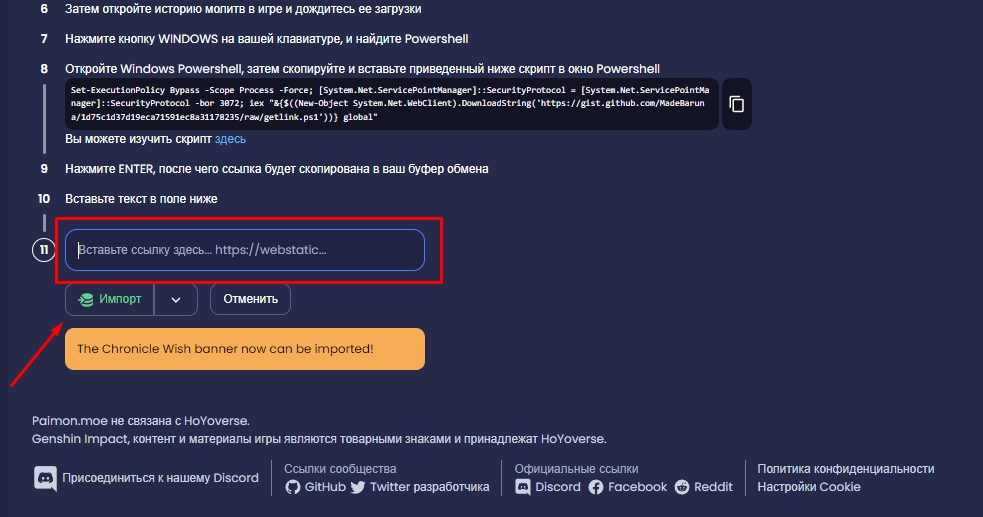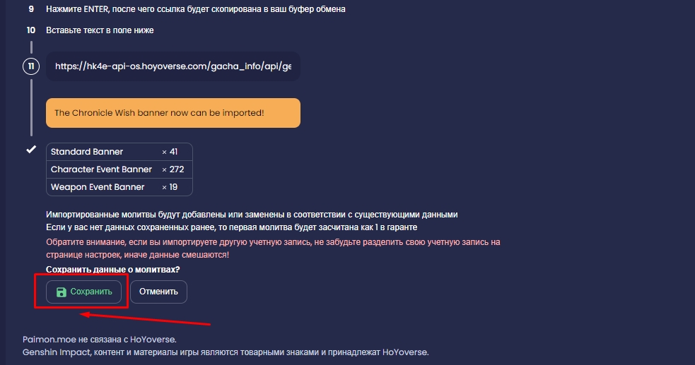 - Вставьте автоматически сохраненный в буфер обмена текст в соответствующее поле на сайте Paimon.moe;