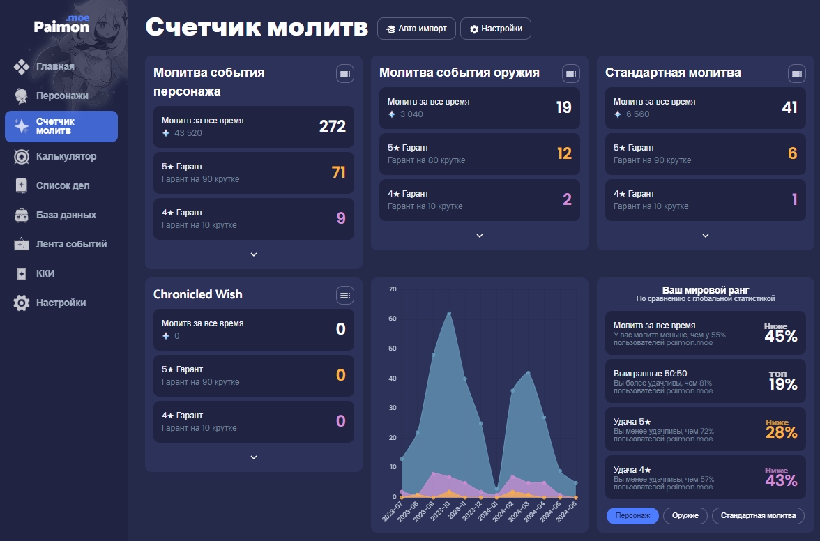 Самый популярный сайт для подсчета круток называется Paimon.moe. Он нравится многим из-за понятного интерфейса и количества информации, которую он собирает о конкретном аккаунте. С его помощью вы сможете не только высчитать свой «гарант», но сформировать чек-лист активностей, а также узнать: