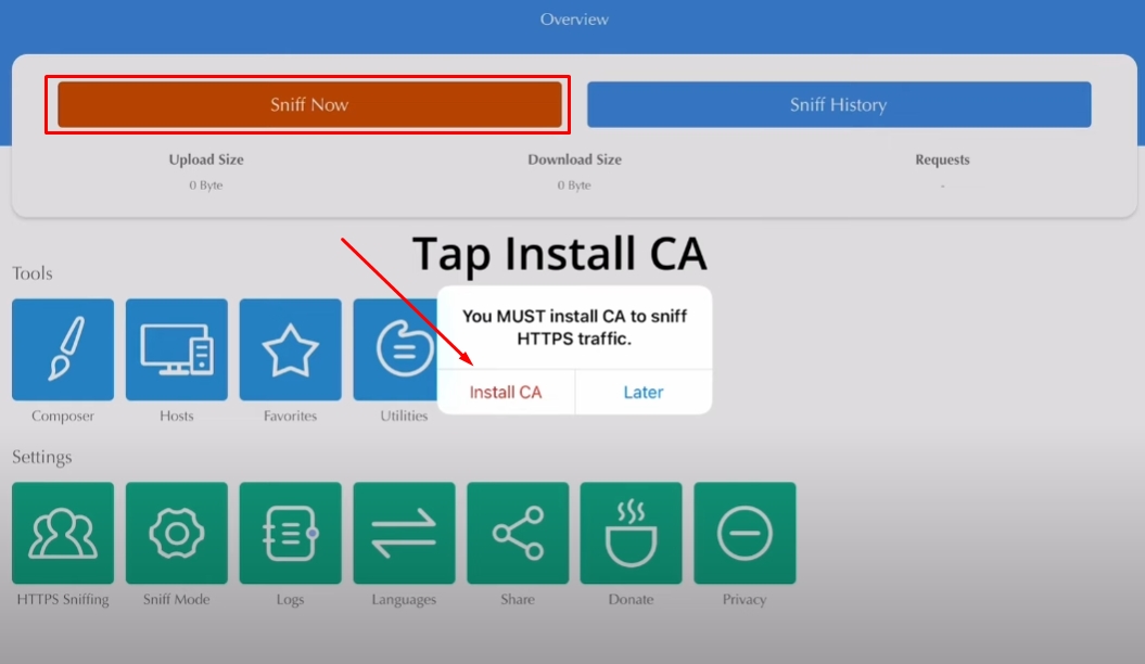 - Откройте Stream и кликните по кнопке «Sniff Now», чтобы установить CA;