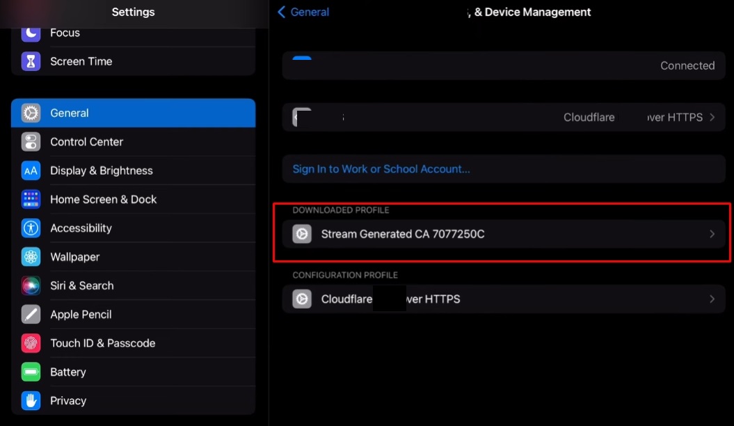 - Зайдите в настройки устройства -> Основные -> «Управление устройством» -> нажмите «Stream Generated CA» и установите профиль Stream Generated CA;
