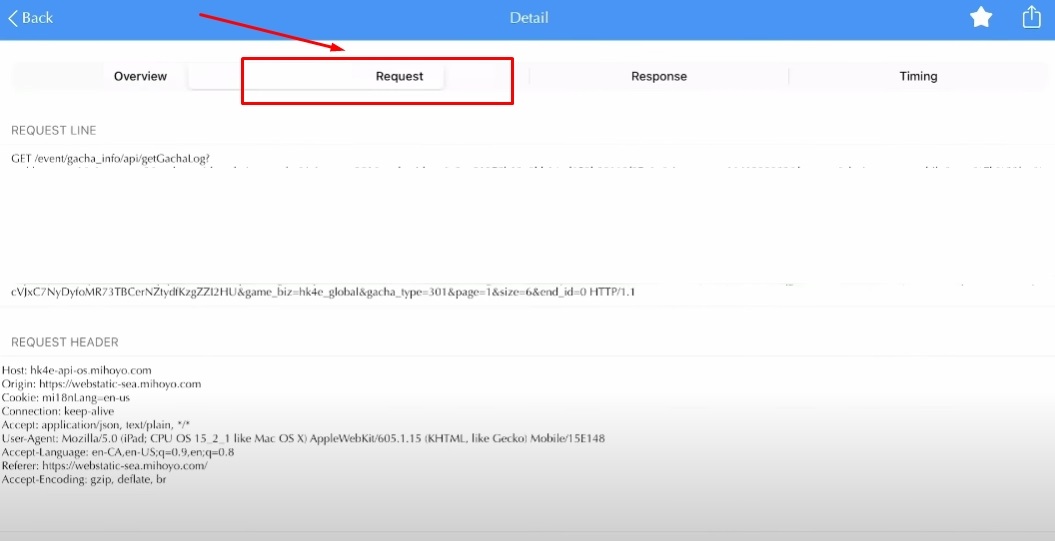 - На вкладке «Request» скопируйте ссылку и вставьте ее в счетчик молитв на сайте Paimon.moe;
