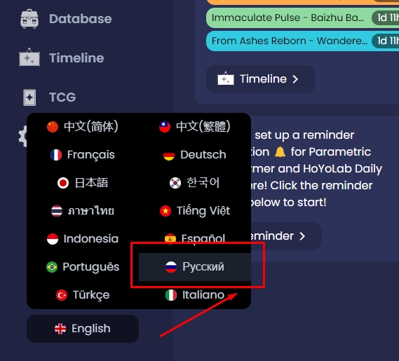 Первое, что вам нужно сделать – перейти на сайт Paimon.moe и зайти в раздел «Счетчик молитв» («Wish counter»). Если весь интерфейс сервиса на английском языке, переключитесь на русский в левом нижнем углу экрана: