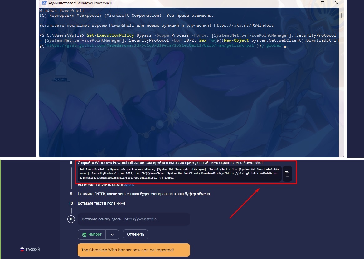 iex('Write-Host "Copy the wish history table!";while(1) { $c = Get-Clipboard -TextFormatType Html; if ($c -match "^SourceURL:https:/.+log") { break; }; for($i=5; $i -gt 0; $i--) { Write-Host "`rChecking in $i" -NoNewline; Sleep 1; }; }; Write-Host " OK"; $m=(((Get-Clipboard -TextFormatType Html) | Select-String "(https:/.+log)").Matches[0].Value);$m; Set-Clipboard -Value $m;') |