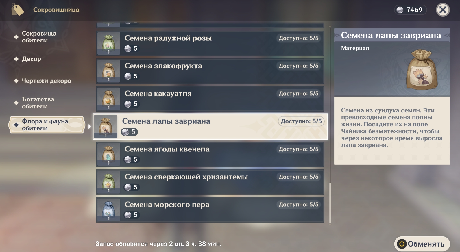 - Пакетик с семенами. Он продается у распорядителя вашего жилища, Пухляша (раздел «Сокровищница» -> «Флора и фауна…»). Стоимость товара – 5 сокровищ обители. Игроки могут приобрести до 5 пакетиков с конкретными семенами еженедельно. Альтернативный источник семян Лапы завриана: