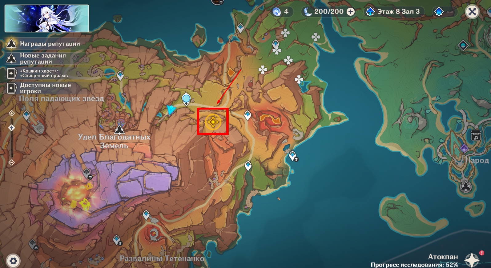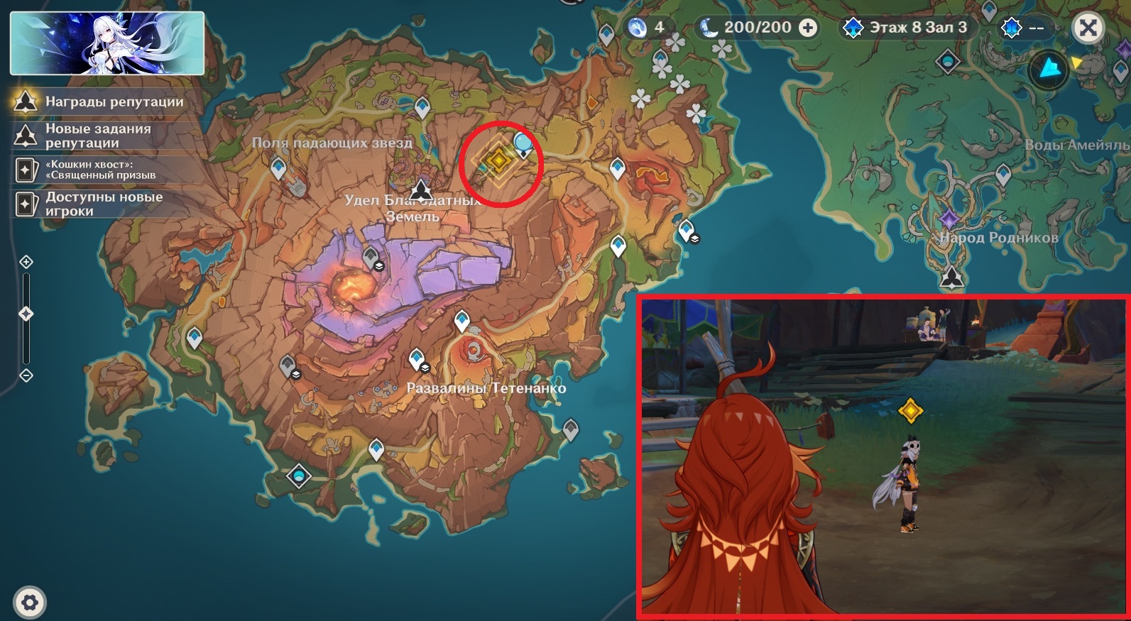 Когда разговор с Иансан и Ситлали подойдет к концу, вас автоматически телепортирует к статуе Семи Архонтов в Атокпане. Идите к пещере, которую вы обнаружили во время патрулирования окрестностей Удела Благодатных Земель и осмотрите ее. К сожалению, ничего нового главная героиня там не найдет. Однако позже к пещере прибежит странная девушка, утверждающая, что за ней гонятся монстры. Путешественница не увидит врагов до тех пор, пока не прикоснется к незнакомке.