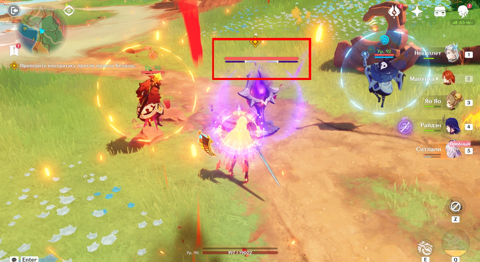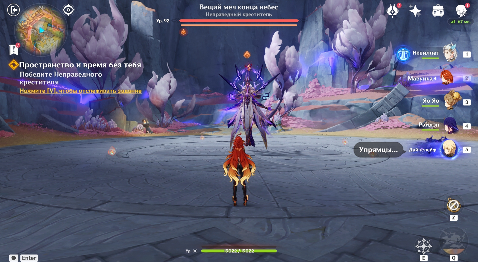 7 | После выводов начнется бой с Неправедным крестителем. Он похож на босса из Разлома в Ли Юэ – Чудовищного крестителя. Это означает, что в ходе сражения монстр пользуется способностями нескольких стихий и постоянно защищает себя разными элементальными щитами (не больше двух). Чтобы пробить защиту и нанести монстру большой урон, постоянно призывайте на помощь Дайнслейфа | ![]() |