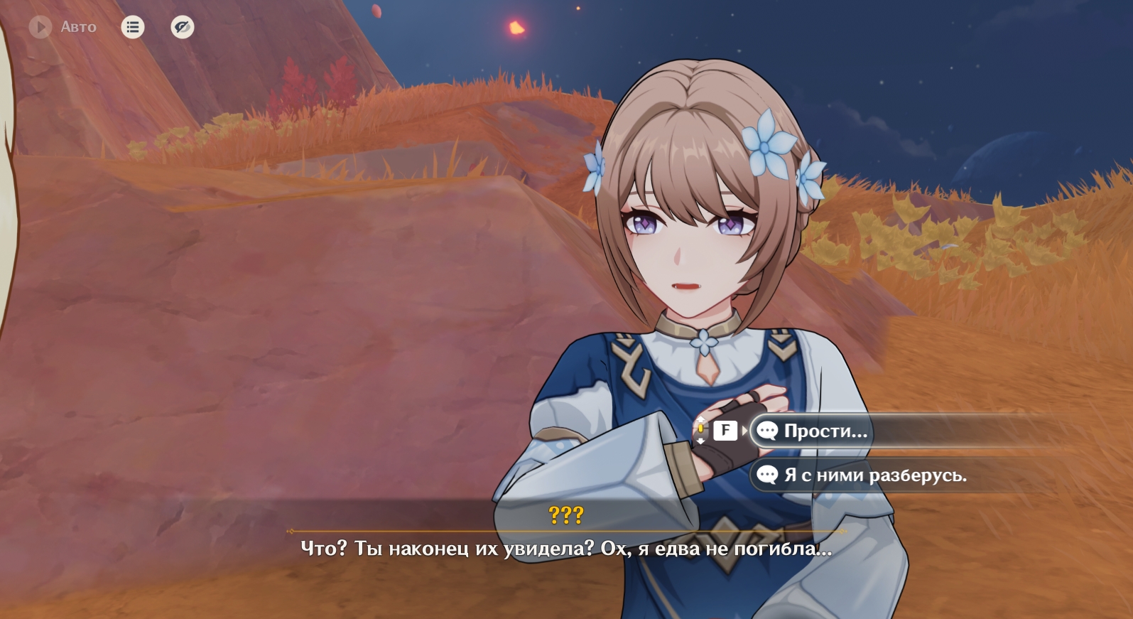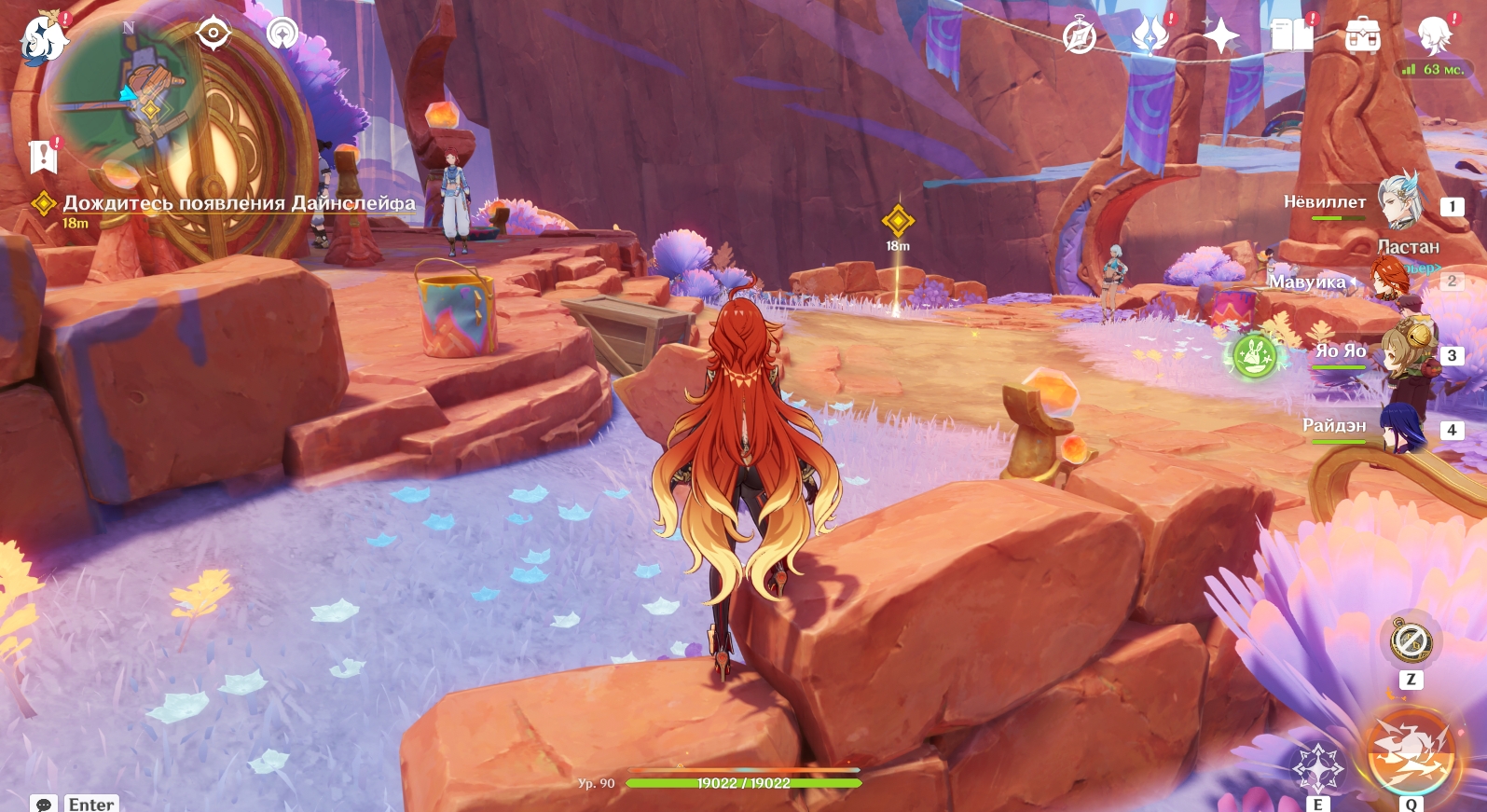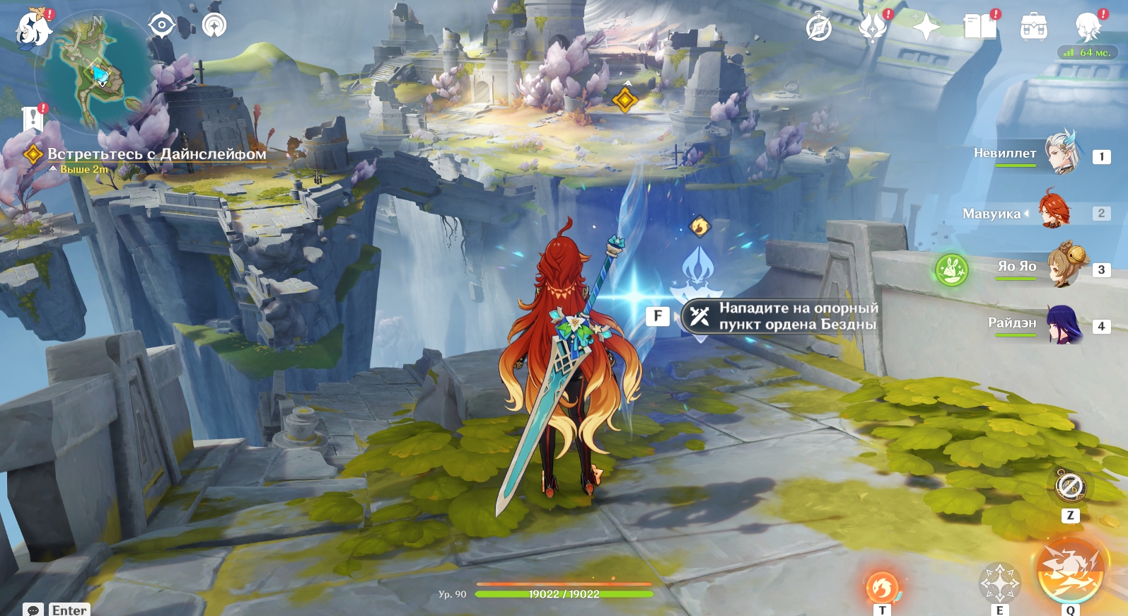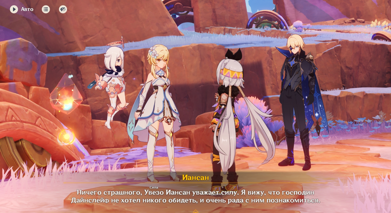 Отправляйтесь на юго-восток и подойдите к квестовому маркеру, чтобы встретиться с ним. После беседы перемотайте время на 8:00-10:00 следующего дня с помощью часов в меню Паймон, а потом найдите Дайнслейфа и Иансан в центре поселения. Они сообщат, что обнаружили штаб Ордена Бездны.
