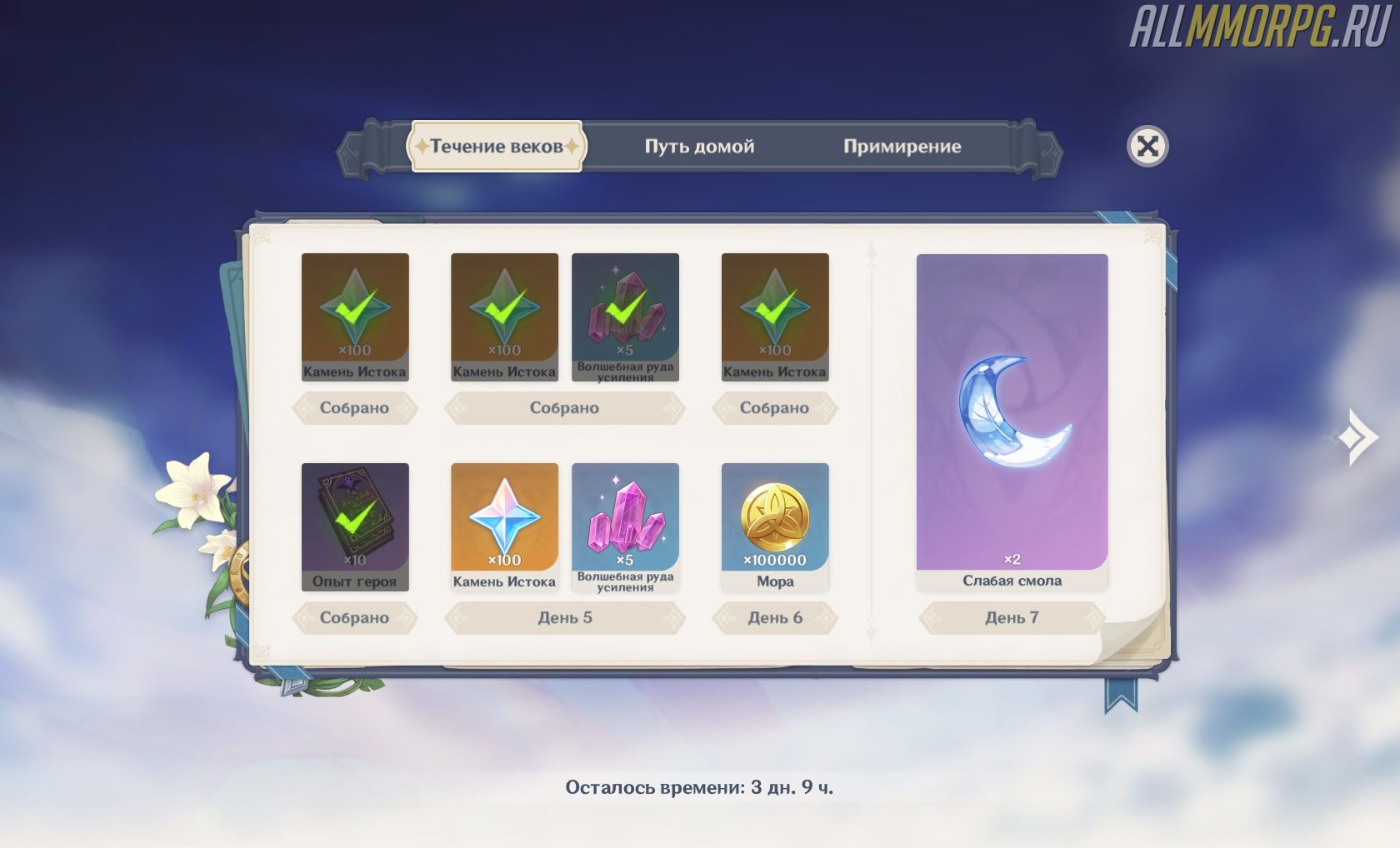Чем чаще вы заходите в игру, пока активно событие, тем больше вы получите Камней Истока за все время. На изображении ниже показано, какие награды выдают за участие в событии «Течение веков».