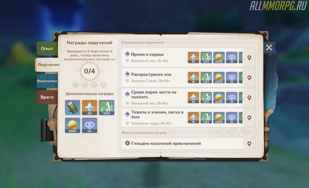 Поручения – это несложные ежедневные задания. Обычно их суть сводится к решению простых головоломок, убийству нескольких монстров или разрушению каких-либо объектов в лагере противника. Выполнив все 4 ежедневных поручения, вы получите опыт приключений, Камни Истока и многое другое.