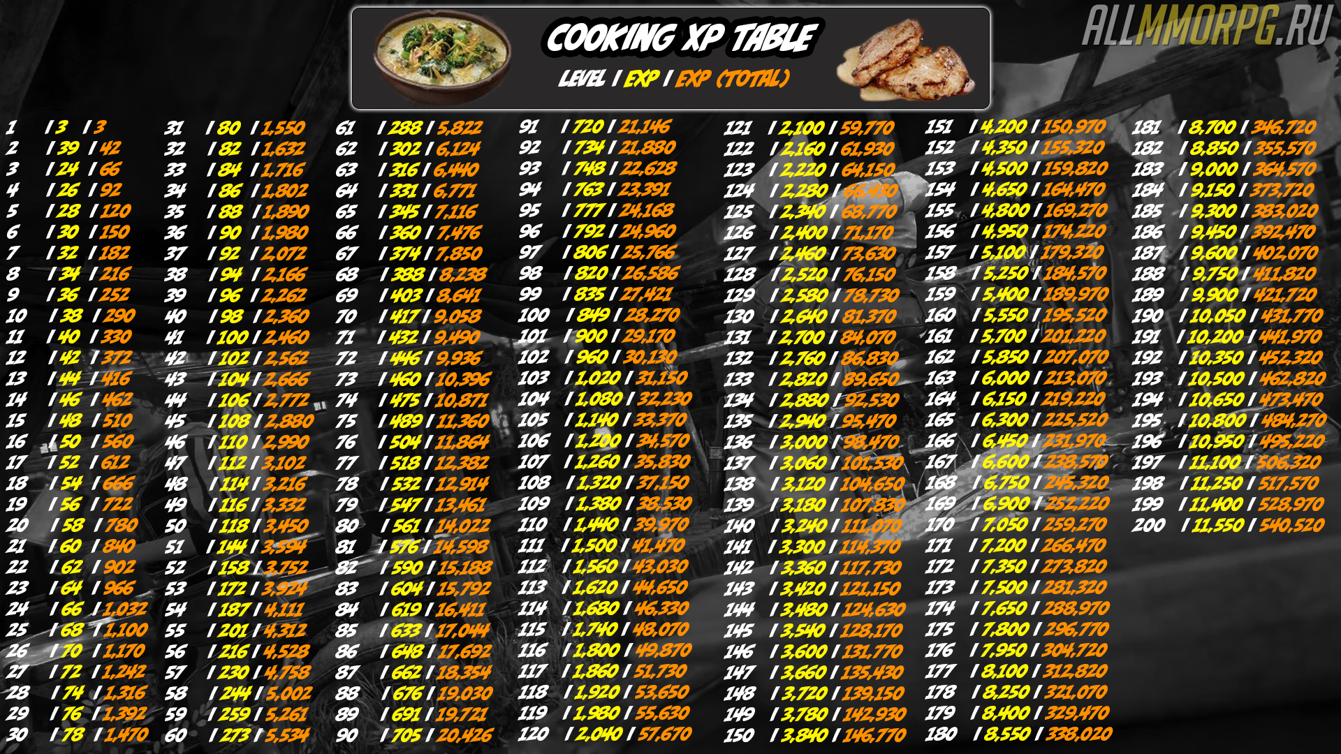 - Уровень 150 - 200: Hearty Meal / Energizing Hearty Meal (775 единиц опыта за порцию)