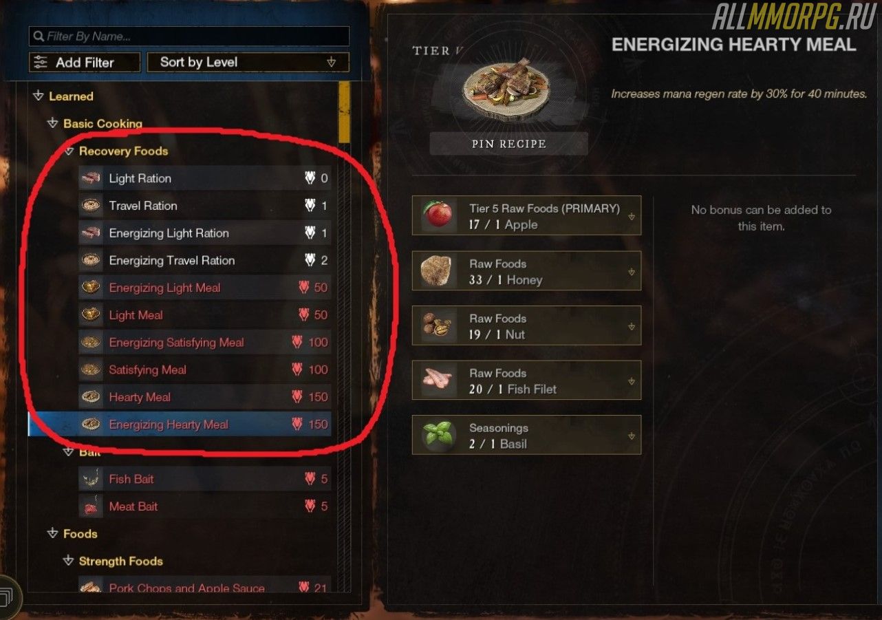 - Уровень 50 - 100: Light Meal / Energizing Light Meal (90 единиц опыта за порцию)