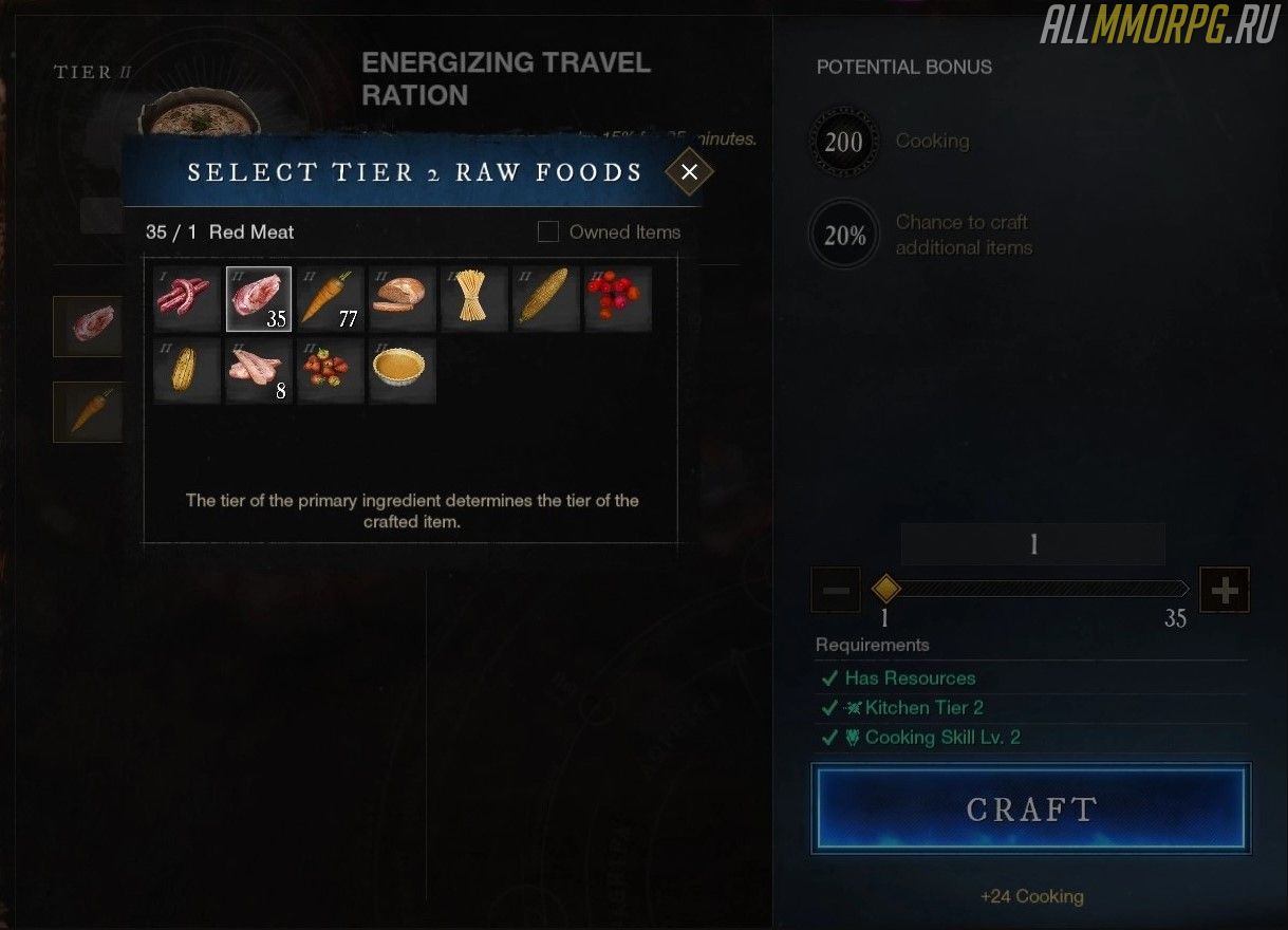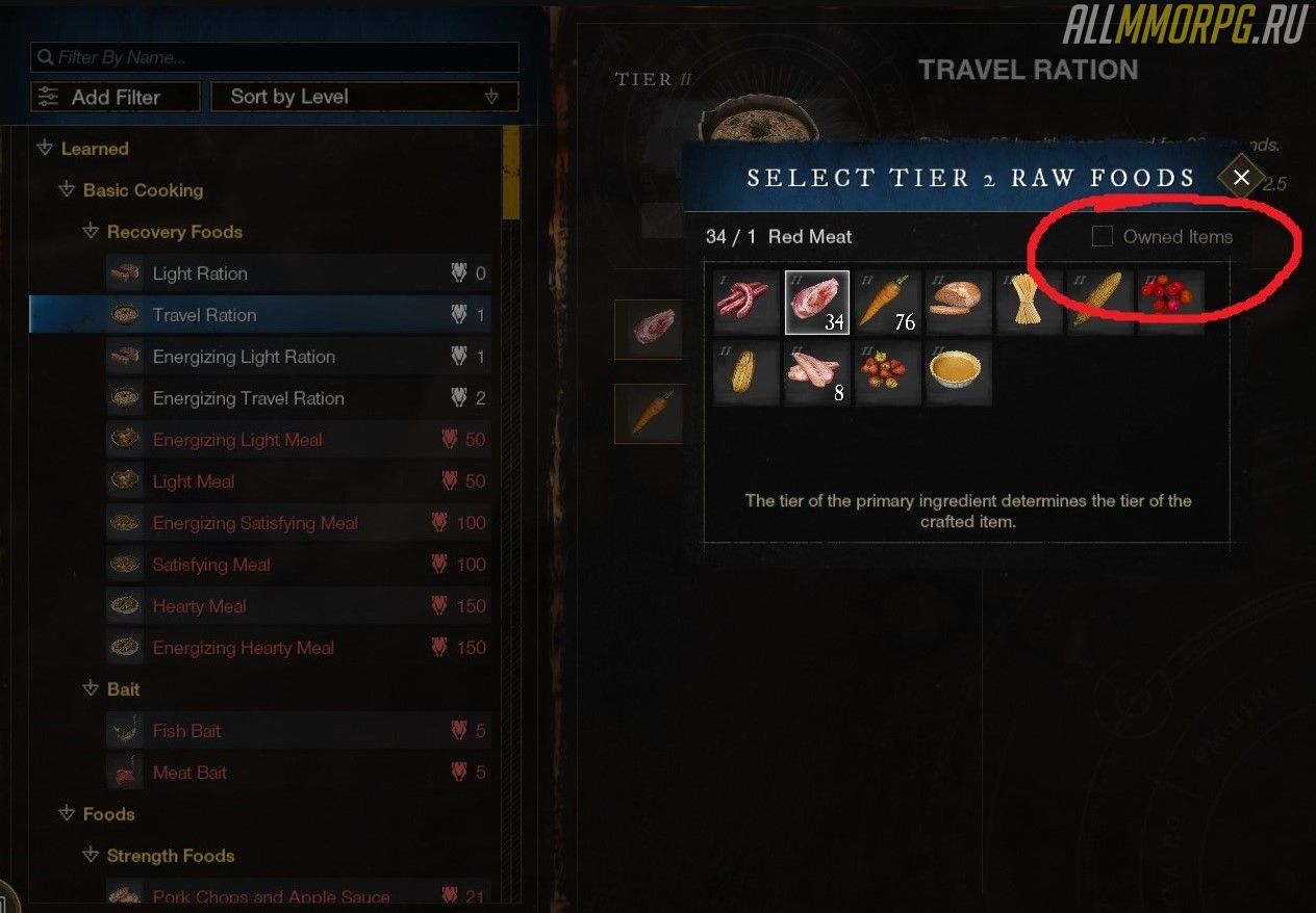 В рецепте на Travel Rations используются ингредиенты двух типов, Raw Foods и Raw Foods, тир 2. Обязательно зайдите в выпадающее меню и отключите галочку Owned Items, чтобы увидеть все доступные варианты.