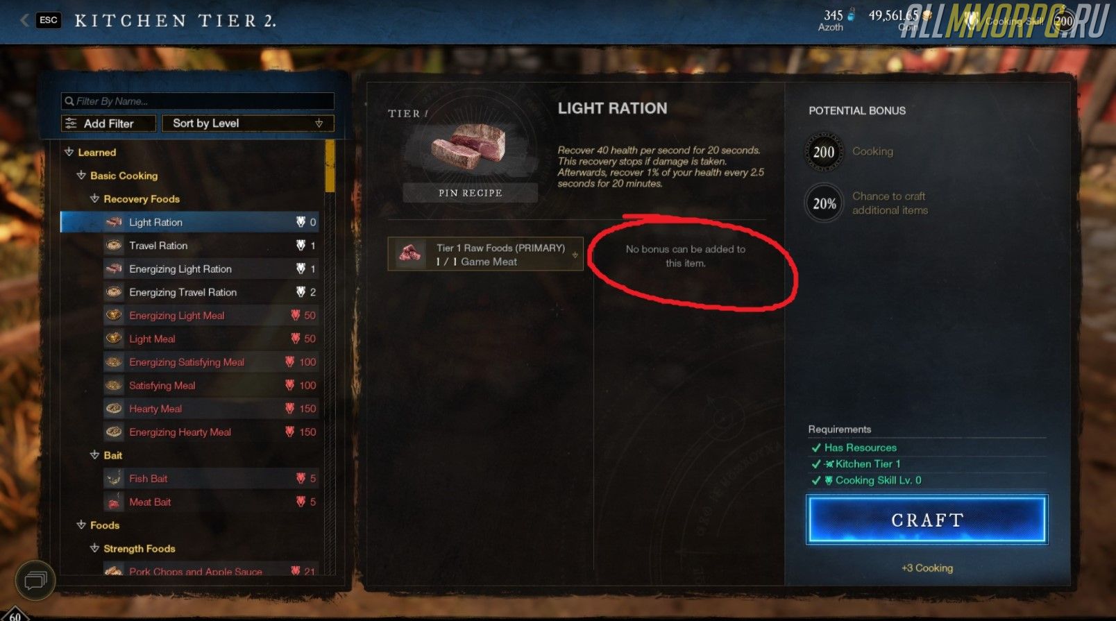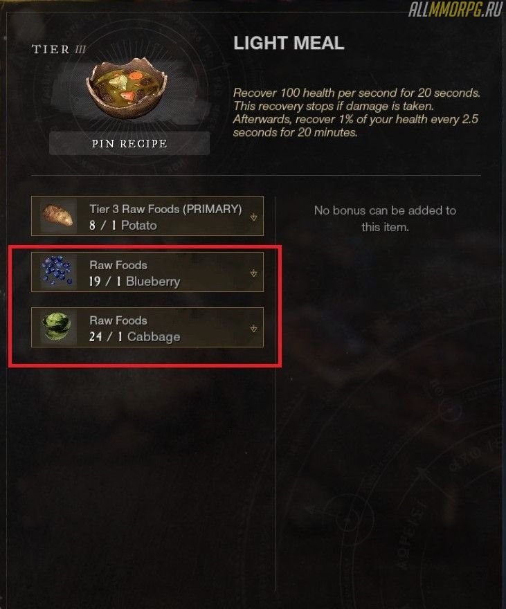 Примечание: надпись "No bonus can be added to this item." в кулинарии отображается по умолчанию. В других ремеслах (например, алхимии) персонажи могут наделять изготавливаемые предметы дополнительными свойствами, используя дополнительные реагенты (в той же алхимии Azoth увеличивает вероятность появления характеристик и слотов для камней). В кулинарии таких вариантов нет.