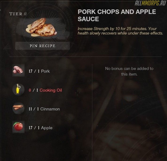 Вы можете изготавливать еду с чистыми или комбинированными характеристиками. К примеру, Pork Chops and Apple Sauce второго тира дают 10 единиц силы на 25 минут.
