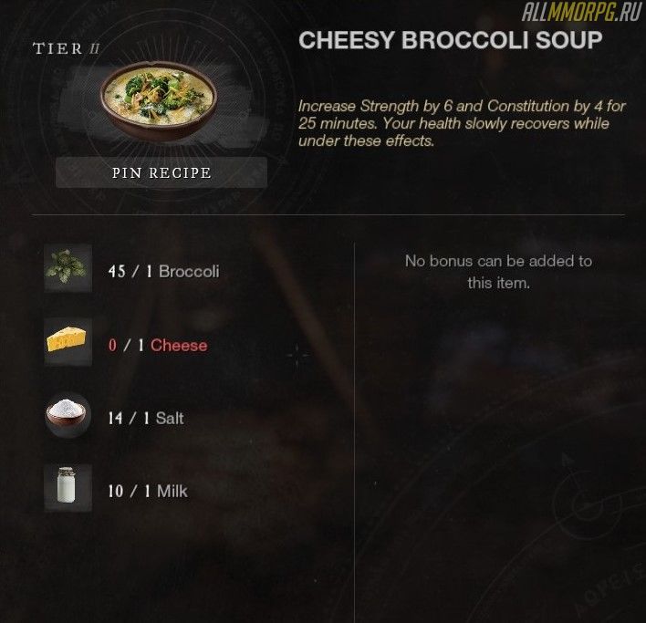 Cheesy Broccoli Soup дает не только силу, но и выносливость (6 единиц силы и 4 единицы выносливости на 25 минут).