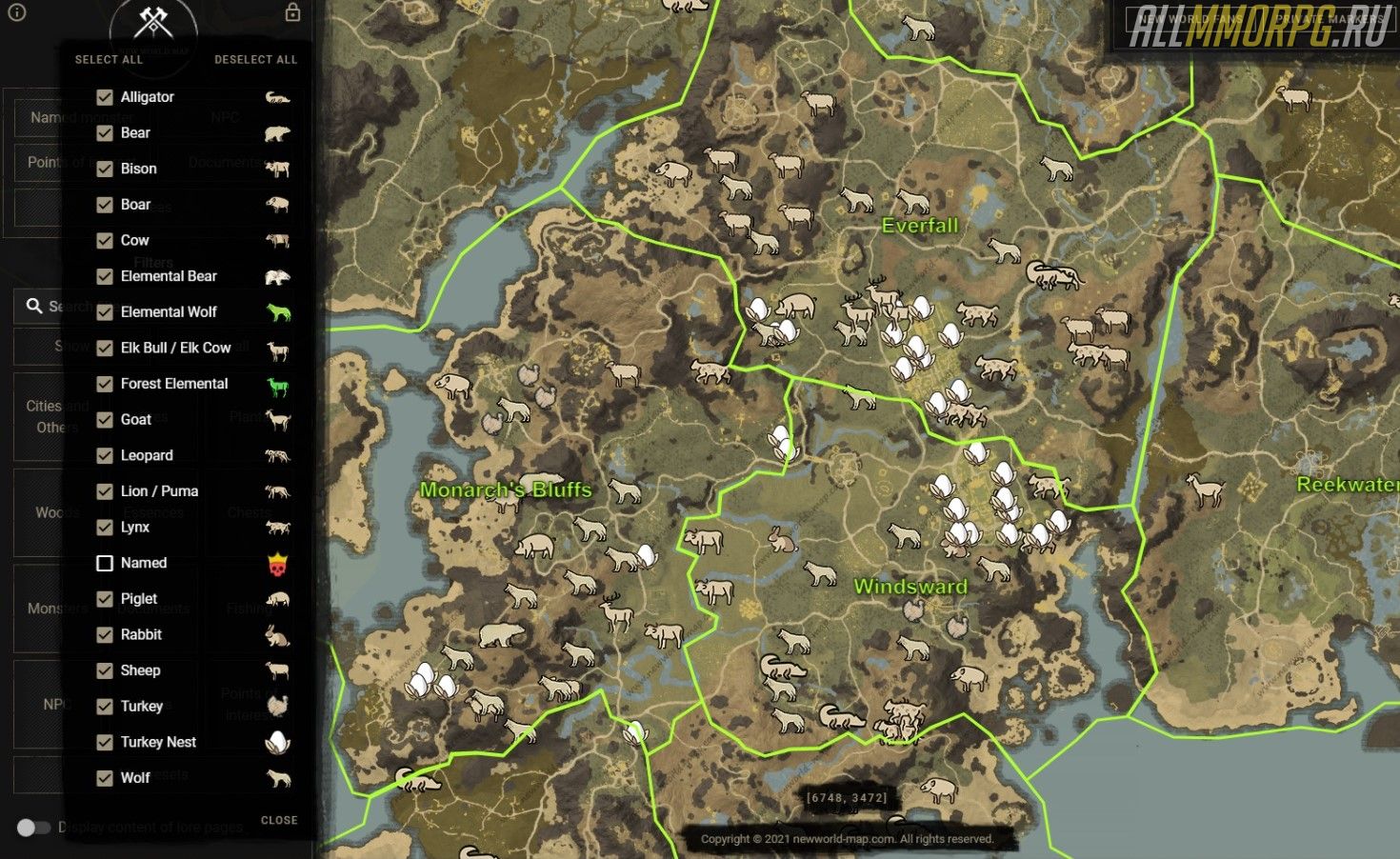 Все источники мяса отображаются на интерактивной карте (необходимо настроить фильтр по типу существ). Аналогичным образом можно найти нужные травы, ящики и так далее.