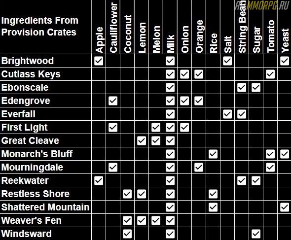 Специи и другие ингредиенты добываются в определенных локациях и из конкретных ящиков с провизией (см. таблицу).