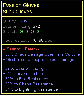 Сверхдорогие перчатки нам не требуются, попытайтесь найти вариант с максимальной прибавкой к здоровью и сопротивлениям, базу лучше выбрать на уклонение.