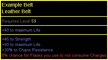 В бюджетной версии билда используется редкий пояс (Ремень) с максимально возможной прибавкой к здоровью и, возможно, силой. Также вам не помешают стихийные сопротивления и сопротивление к хаосу (если их не хватает), а также вероятность не потратить заряд при использовании флакона.