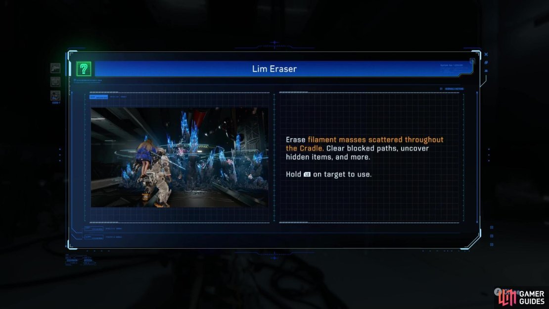 Lim Eraser — это уникальная способность главного героя, Diana, которая позволяет уничтожать Filament Masses и получать доступ к ранее недоступным зонам. Она автоматически открывается во Sector 2 в блоке Lim Recycling Facility. Вот подробный маршрут: