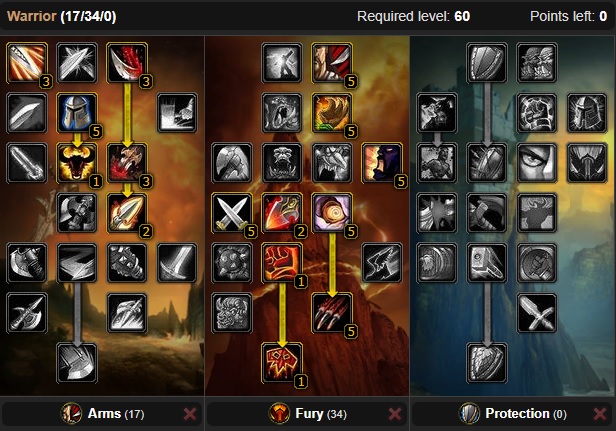 Выбор талантов в дереве "Неистовства" очевиден, так как многие варианты не дают прибавки к урону. Конечной целью являются Инстинкт смерти и Шквал, их необходимо дополнить Глубокими ранами и Прокалыванием из ветки "Оружие".