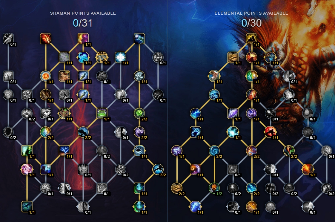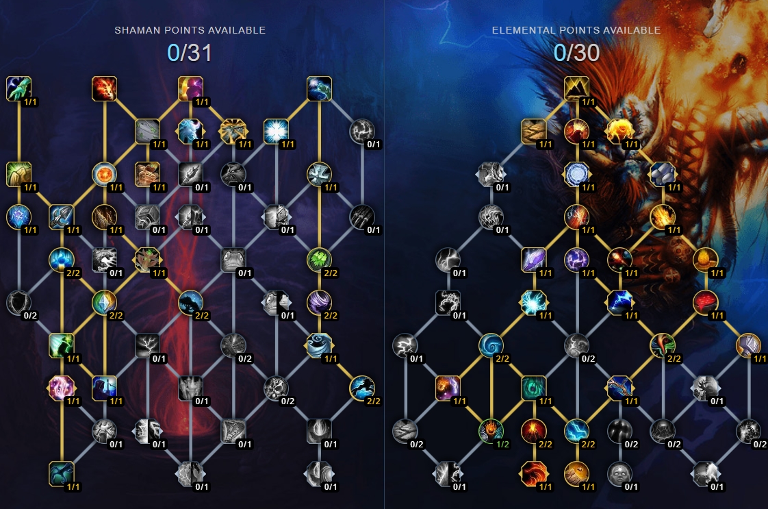 В билде целенаправленно опущены некоторые вспомогательные таланты - в частности, Очищение духа, Гром и молния и Развеивание магии. Их можно добавлять или убирать в зависимости от механики босса, с которым вы планируете сразиться. В классовом дереве можно переключаться между Сила тотемов, Тотемное средоточие, Возвращение тотемов и Зов стихий. Гром и молния и Громовой удар подходят для боев с особыми механиками.