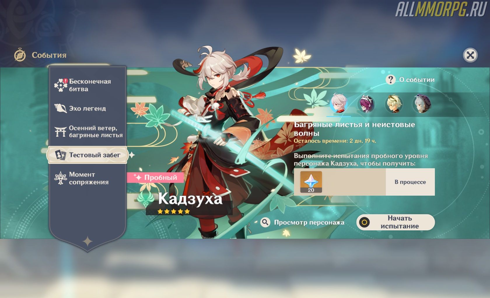 На момент написания статьи в Тестовом забеге активен Кадзуха. За ознакомление с его способностями игроки получат 20 Камней Истока. Помимо Кадзухи вам доступно тестирование других героев, но за них Камни Истока не дают.