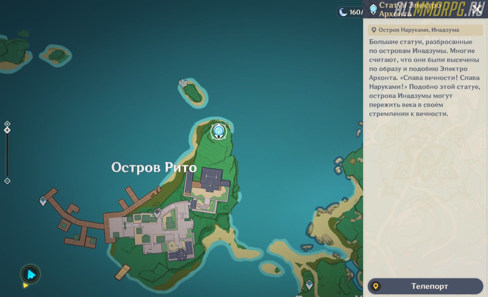1. Переместитесь к любой статуе Семи Архонтов в Инадзуме. Местоположение этих объектов отмечено на карте региона круглой голубой меткой. Одна из таких статуй находится в стартовой локации под названием Остров Рито, куда игрок прибывает на корабле Бэй Доу;