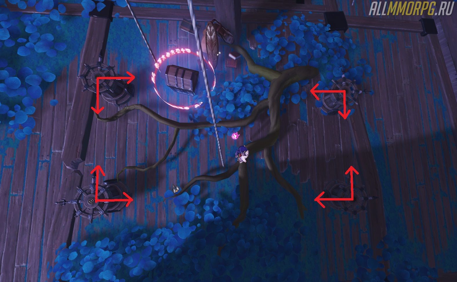 Добравшись до корабля, заберитесь наверх к заблокированному сундуку. Рядом с ним вы найдете четыре устройства, которые похожи на штурвалы. Если посмотрите на них внимательно, то увидите, что две из восьми рукоятей отличаются по длине. Вам нужно повернуть каждый из штурвалов так, чтобы эти длинные рукояти были направлены друг к другу. На изображениях ниже показано, как выглядят эти рукояти и как их нужно расположить.