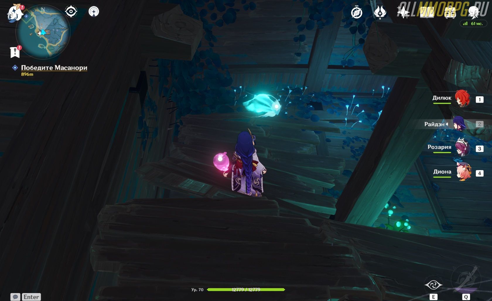Подойдите к краю. Внизу вы увидите несколько представителей Фатуи и самураев. Будьте осторожны!