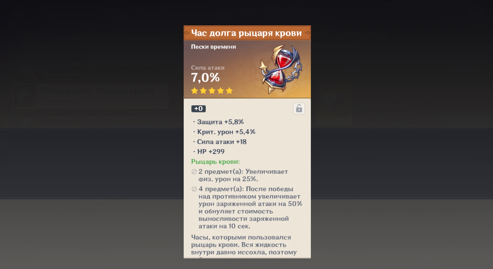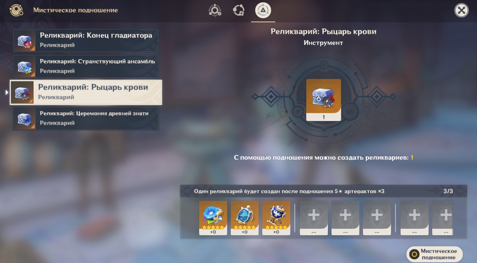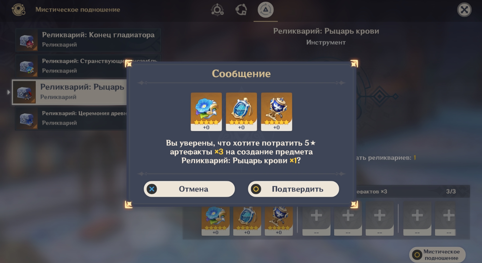 Вы можете пожертвовать три любых 5-звездочных артефакта, чтобы получить реликварий, содержащий 1 артефакт из указанного вами в левой части экрана набора. Пользоваться этой функцией рекомендовано тем игрокам, у которых много ненужных 5-звездочных артефактов. Если у вас есть несколько ценных артефактов, то не торопитесь менять их на какой-то конкретный. Не факт, что вам выпадет артефакт с нужными второстепенными характеристиками. Здесь все зависит от рандома. Меж тем, если вы хотите быстро собрать полный набор Странствующего ансамбля, Рыцаря крови и проч., чтобы получить ценные бонусы комплекта – жертвуйте ненужными артефактами без сомнений.
