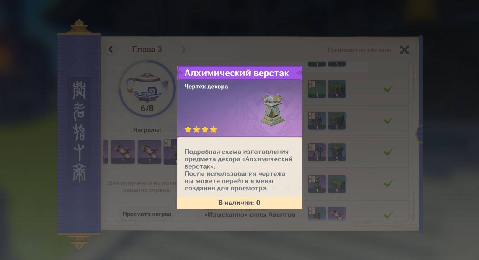 Алхимический верстак можно найти в любой столице Тейвата, но при желании вы можете разместить его в своей обители, если ранее разблокировали Чайник безмятежности. Чтобы изготовить собственное алхимическое оборудование, вам придется прокачать свое жилище, а именно – выполнить все требования 3 главы заданий обители. Как только вы завершите третью главу, получите несколько чертежей комплектов декора и чертеж на изготовление персонального алхимического верстака.