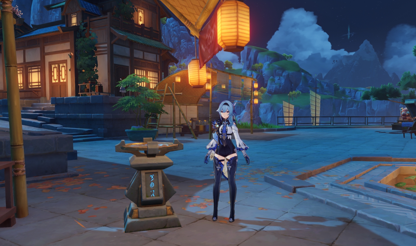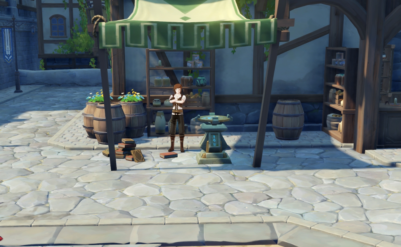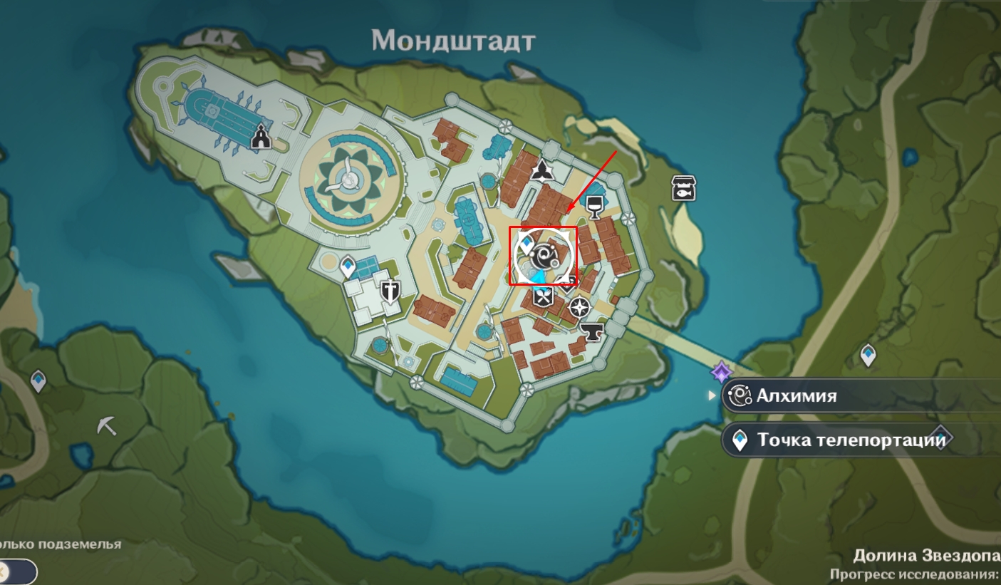 1. Найдите алхимический верстак в главной столице Мондштадта. Он расположен рядом с точкой телепортации возле фонтана (см. изображение ниже). Подойдите к нему и взаимодействуйте, чтобы открыть меню крафта.