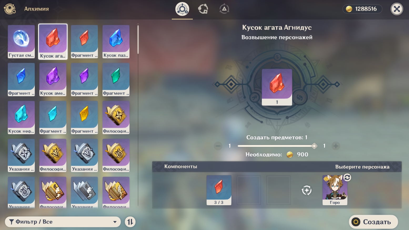 Алхимия позволяет изготавливать не только зелья и инструменты, полезные для исследования Тейвата. С ее помощью можно объединить слабые материалы для возвышения героев/оружия и прокачки талантов в более редкие. К примеру, если вам не хватает Куска агата Агнидус, чтобы возвысить Дилюка или Янь Фэй, вы можете изготовить его на алхимическом верстаке.