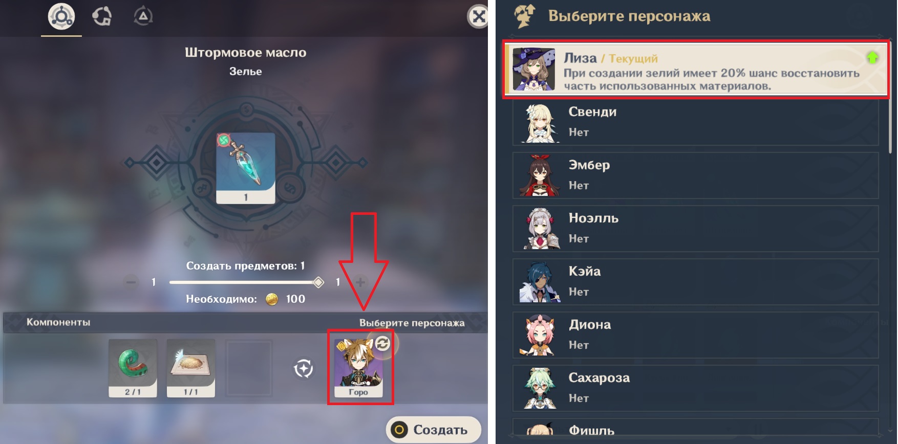 Примечание: если вы уже получили бесплатного героя Лизу, то перед тем, как создать зелье или другой алхимический предмет, выберите ее в окошке справа от перечня ингредиентов (см. изображение ниже). Благодаря ее пассивному таланту «Знаток зелий» вы сможете вернуть часть потраченных на крафт зелий материалов с вероятностью в 20%. Таланты с бонусами к алхимии есть и у других некоторых героев, поэтому во время крафта не забывайте проверять наличие персонажей в коллекции, которые сокращают затраты ресурсов или позволяют получить дополнительные предметы.