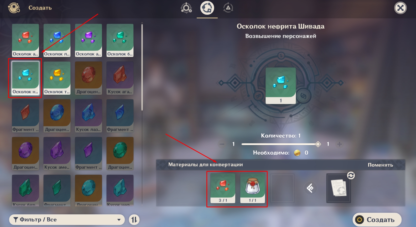 Если вам нужен Осколок нефрита Шивада, но в рюкзаке нет Осколка агата Агнидус, справа от списка компонентов для преобразования найдите изображение двух листков бумаги и нажмите на него. Слева откроется дополнительная вкладка, где можно поменять тип базового материала на тот, который у вас есть в инвентаре. Смена базового материала работает во всех случаях преобразования драгоценных камней.